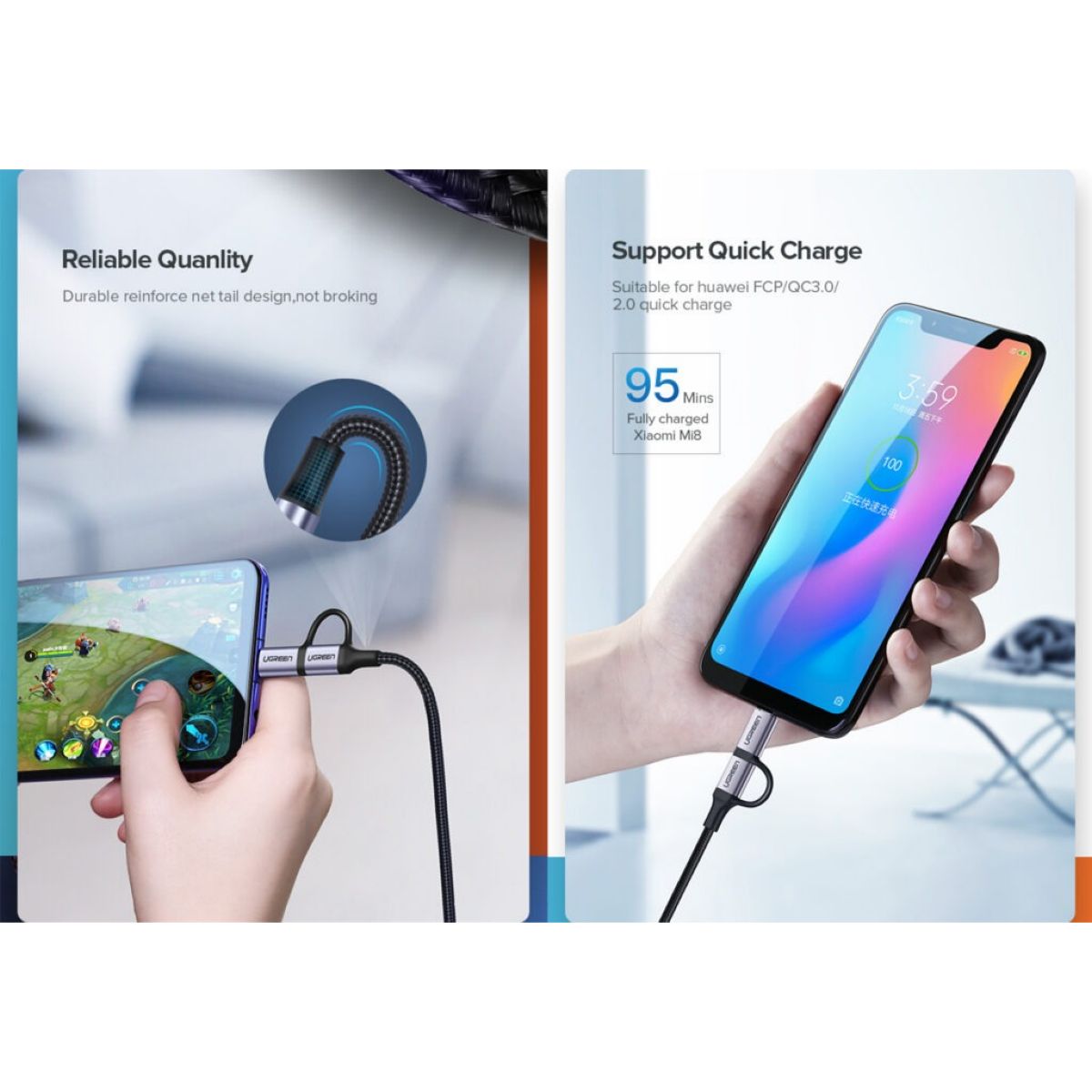 El cable UGREEN US177 de 1 metro es una solución versátil y práctica que combina dos conectores en un mismo producto: Micro USB y USB-C. Ideal para cargar y transferir datos en smartphones, tablets, cámaras y otros dispositivos compatibles.