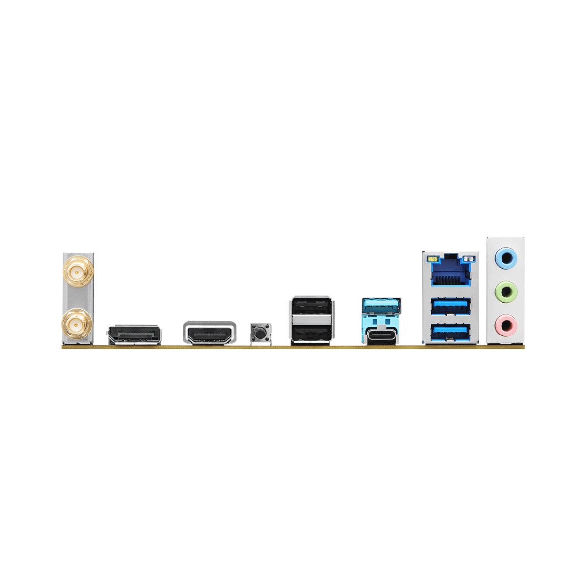 | Panel trasero E/S | - 2 x Puertos de antena - 1 x puerto HDMI - 1 x DisplayPort 1.4 - 1 x puerto USB 3.2 Gen1 Type-C - 3 x USB 3.2 Gen1 Type-A Ports - 2 x puertos USB 2.0 - 1 x Puerto RJ-45 - 1 x Interruptor Flashback del BIOS - Conectores HD Audio: entrada de línea / Altavoz Delantero / Micrófono |