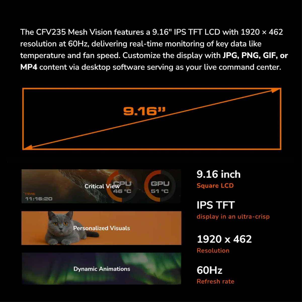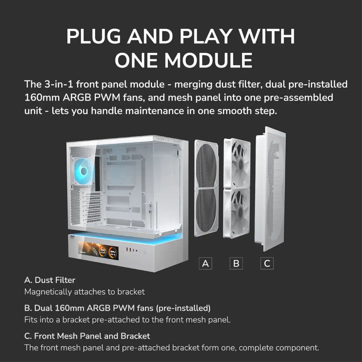 | Sistema de Refriger. | Pre-installed Fans 160mm ARGB PWM fan x 2 120mm ARGB PWM fan x 1 Unity 360 ARGB PWM Reversed fan x 1 |