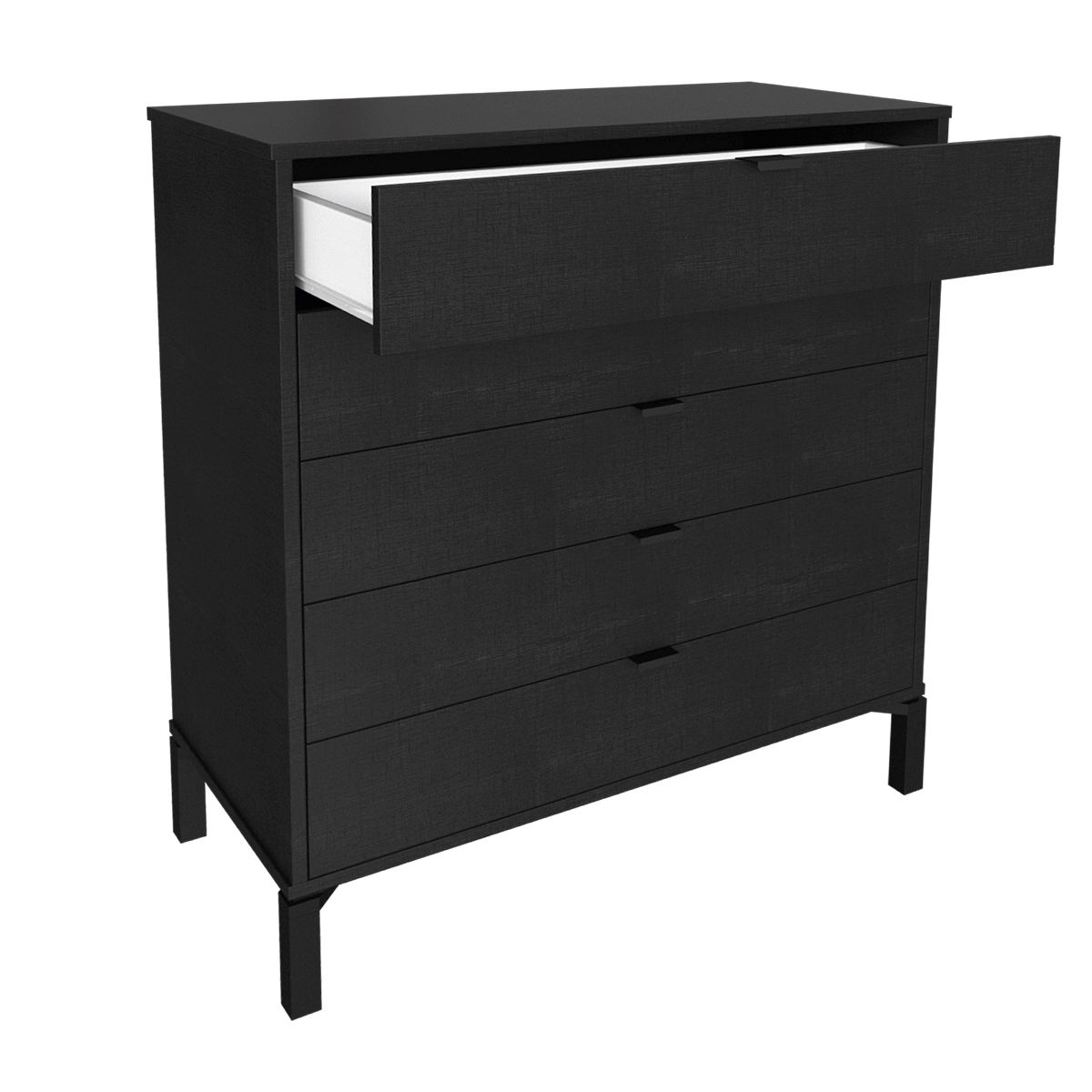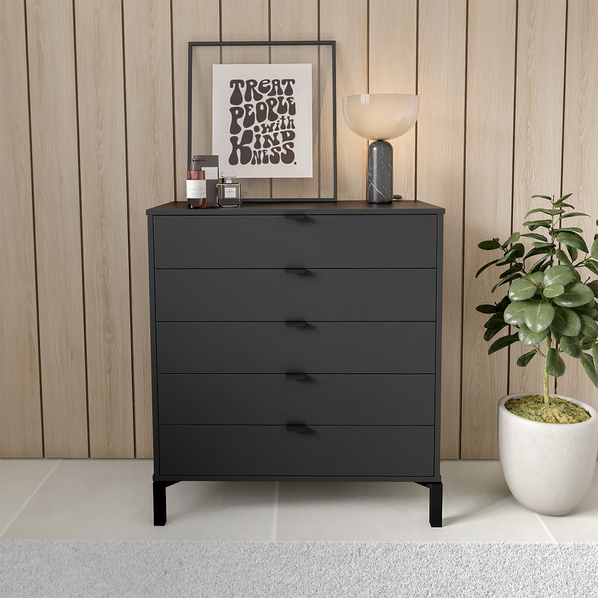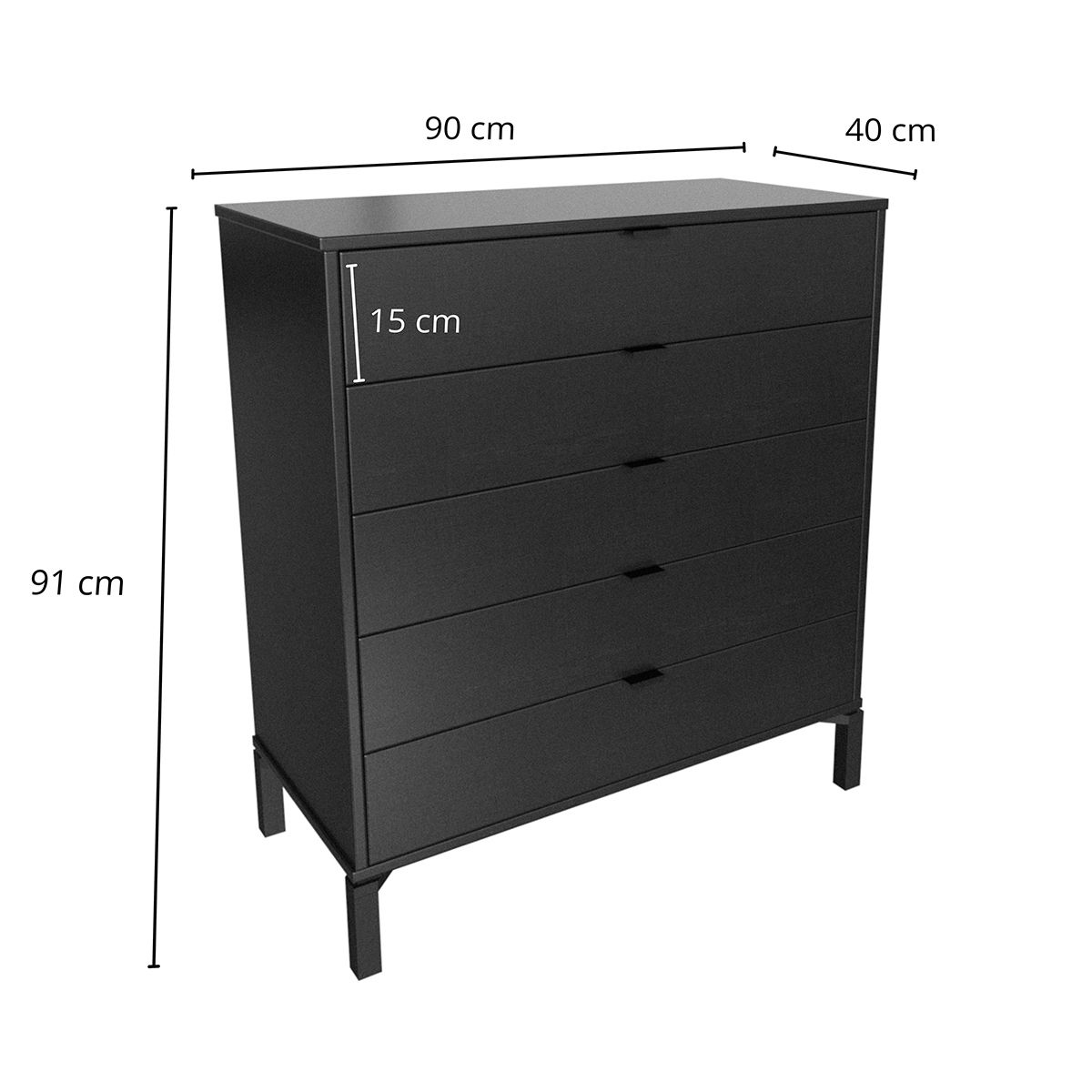 La cómoda Marden de 5 cajones es todo lo que necesitas si buscas practicidad, diseño y calidad en una sola pieza. Su estructura vertical, fabricada en MDP con contrachapado melamínico, garantiza resistencia y durabilidad, mientras que los tiradores metálicos y las patas de madera en negro le aportan un toque moderno y elegante.