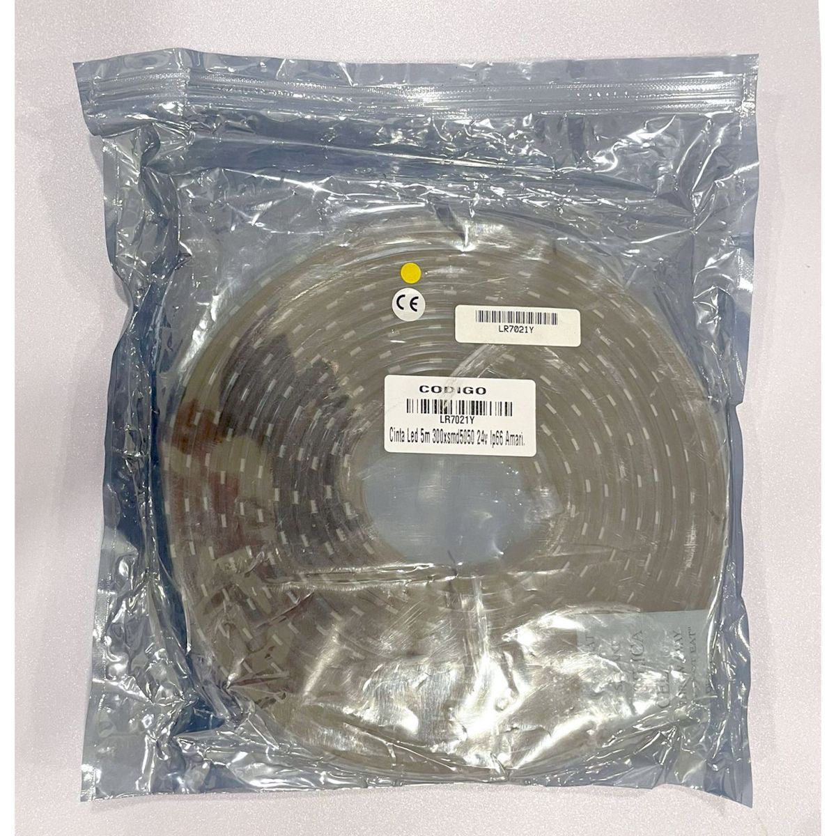 Presentación en rollo de 5 metros con 300 LED's SMD 5050 de alta intensidad que emiten un único color AMARILLO regulable en intensidad y efectos con un controlador (no incluido)