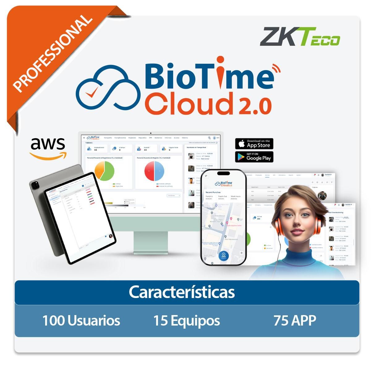 BioTime Cloud 2.0 Professional es la solución en la nube de ZKTeco para la gestión de asistencia y control de horarios, ideal para pequeñas y medianas empresas.