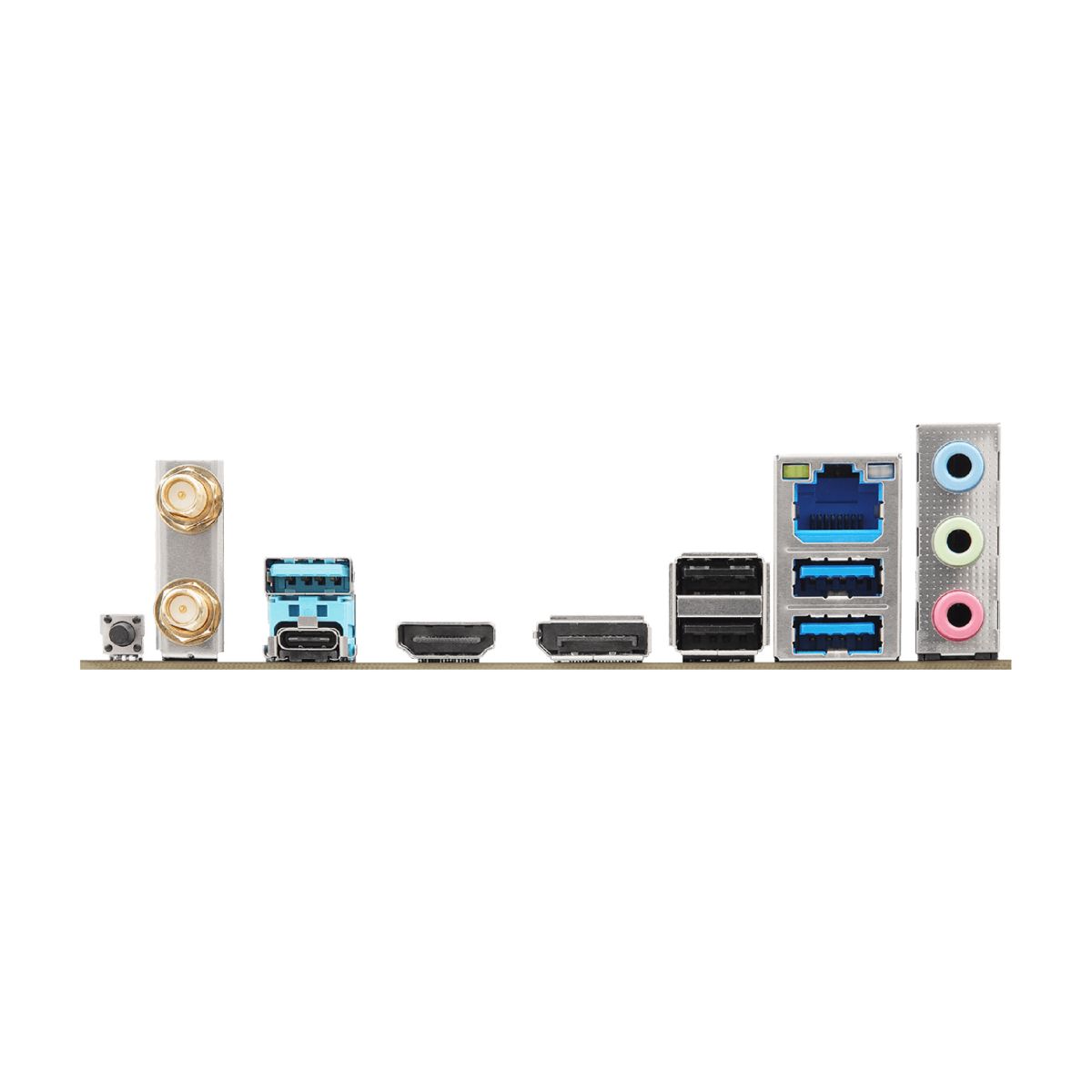 | Panel trasero E/S | 2 x Puertos de antena, 1 x puerto HDMI, 1 x DisplayPort 1.4, 1 x USB 3.2 Gen2x2 Type-C (20 Gb/s), 3 x puertos USB 3.2 Gen1, 2 x puertos USB 2.0, 1 x Puerto RJ-45, 1 x Interruptor Flashback del BIOS, Conectores HD Audio (entrada de línea / Altavoz Delantero / Micrófono). |