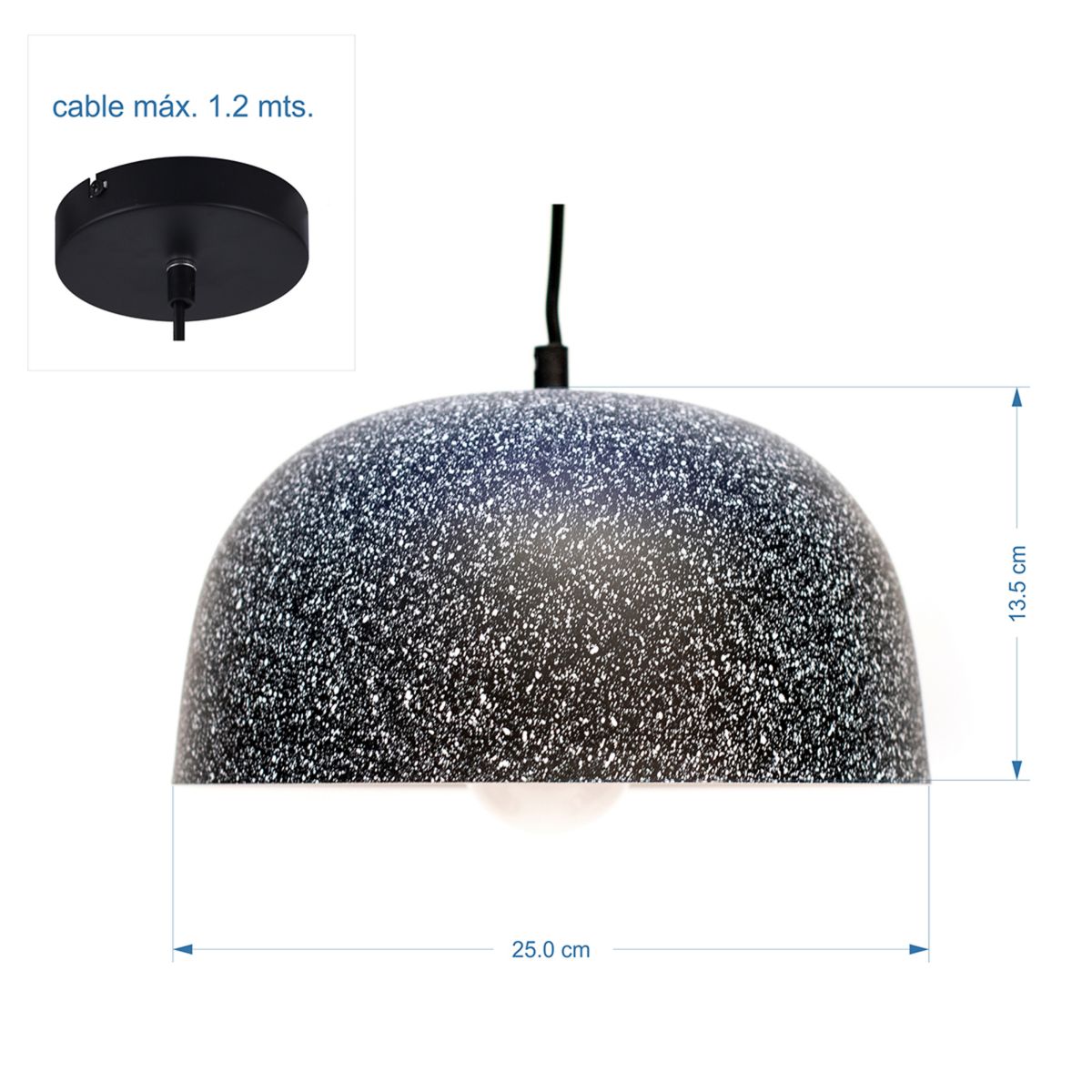 La luminaria colgante Terrazo, presenta una silueta de campana elegante y contemporánea, acentuada por un acabado que simula el efecto del terrazo que aporta un toque actual a su diseño, y la convierte en una pieza contemporánea con aire vintage perfecta para espacios de uso diario.