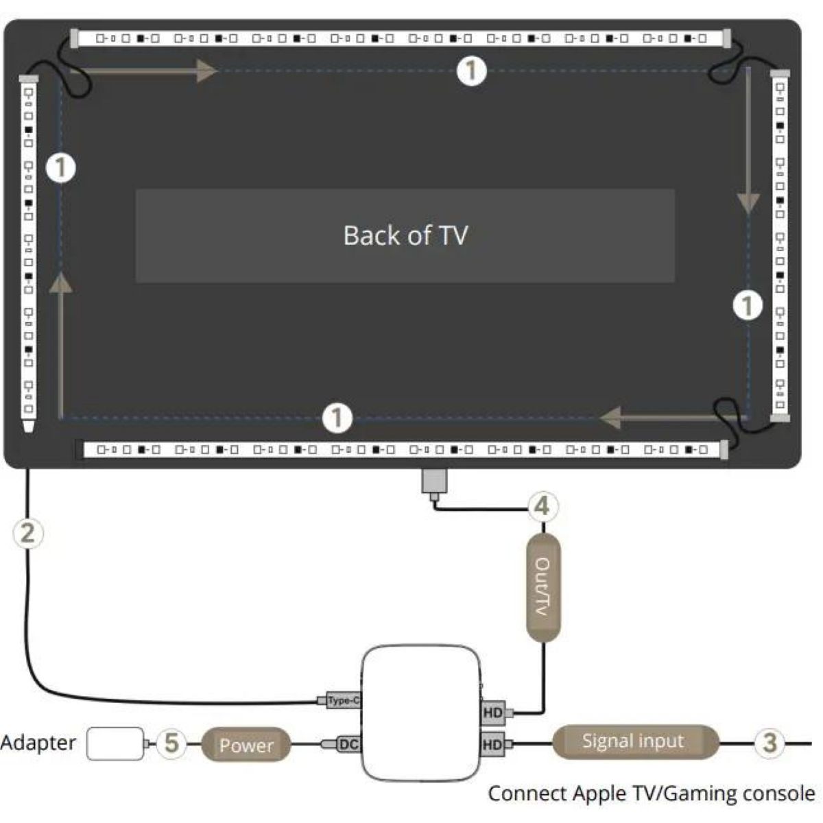 La Retroiluminación de TV HDMI inteligente es una solución innovadora para mejorar tu experiencia visual en la televisión. Compatible con el protocolo HDMI2.0b, ofrece una latencia extremadamente baja y alta precisión en la captura de colores, brindando imágenes vibrantes y dinámicas. Con su capacidad de sincronización en tiempo real, la luz de fondo cambia de color con las imágenes de la pantalla, proporcionando una atmósfera única para ver películas, videos o jugar.