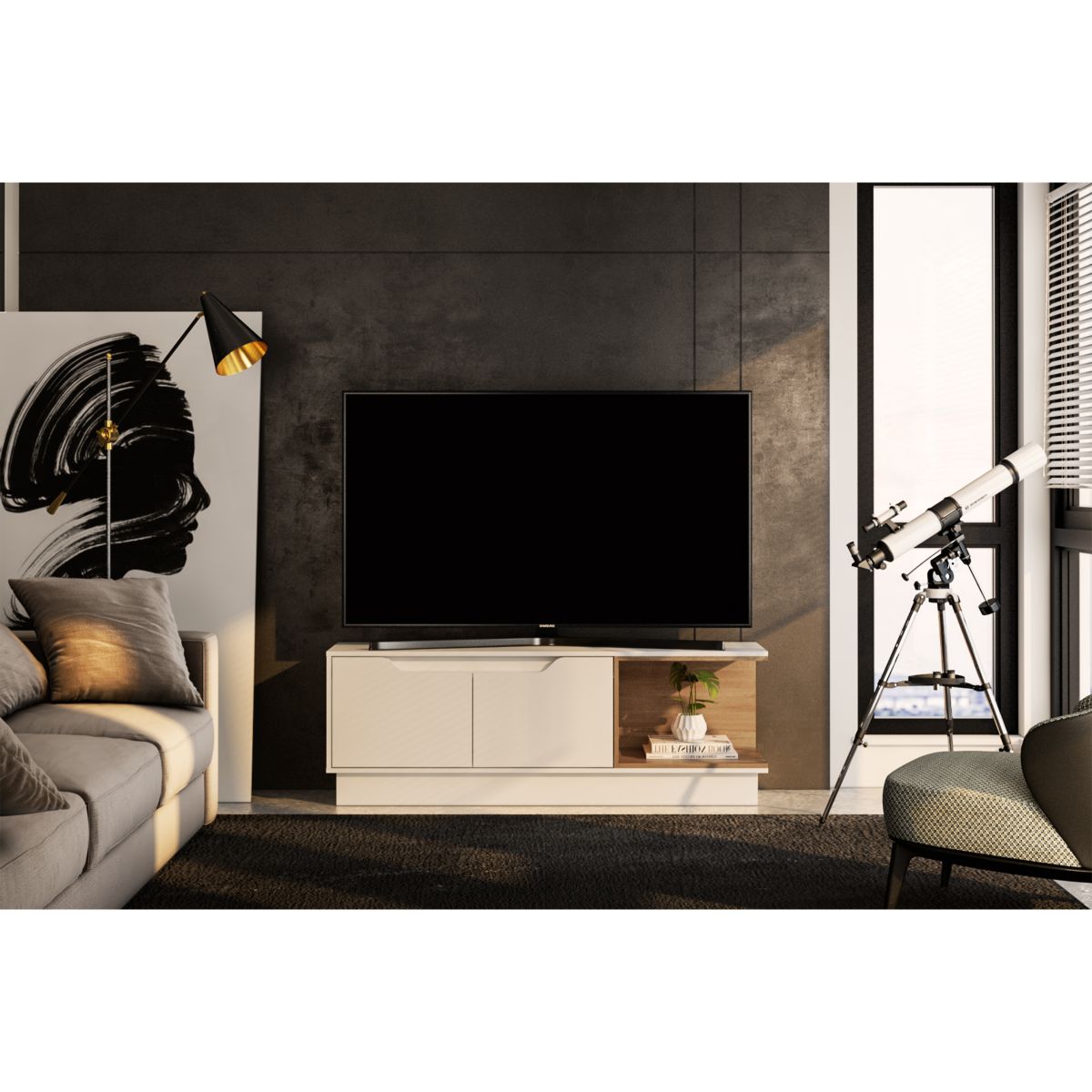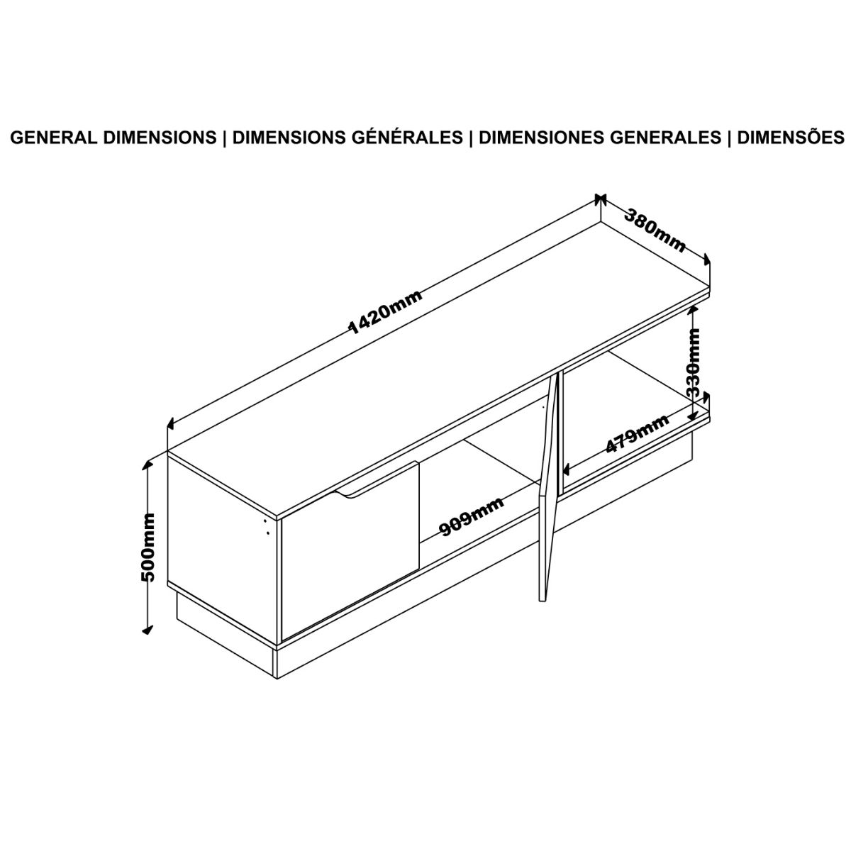 Rack para TV Rodas combinado en blanco y madera. Buena capacidad de guardado, 2 puertas y 1 estante a la vista perfecto libros o adornos. Levanta tu sala de estar y optimiza espacios reducidos.