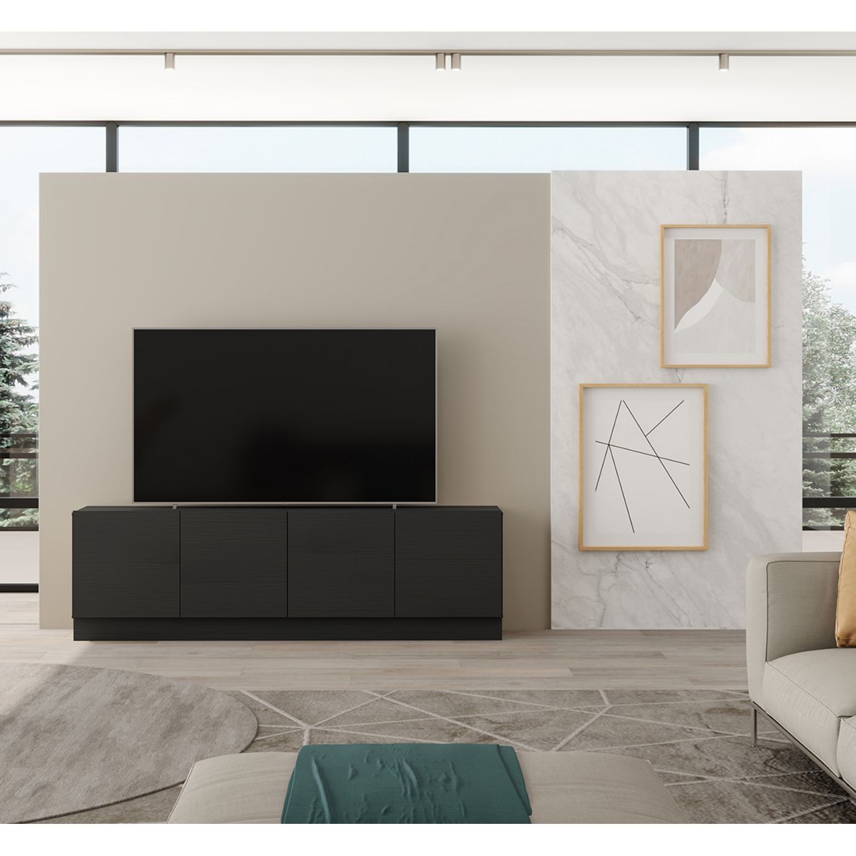 Rack para TV de estilo minimalista, con cuatro puertas y amplio espacio para guardado, perfecto para mantener organizados elementos multimedia y tus imprescindibles del día a día. Una pieza funcional que refleja las tendencias actuales, perfecta para complementar espacios de uso diario.