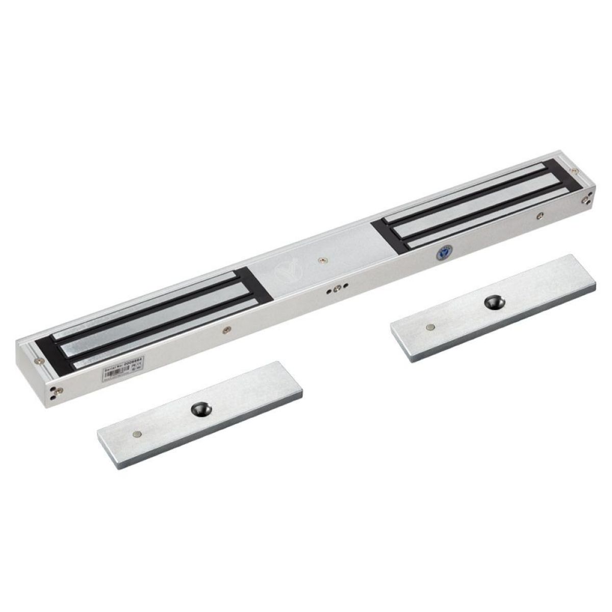 Cerradura magnética doble diseñada para puertas dobles de vidrio, madera o metal. Ideal para sistemas de control de acceso avanzados.