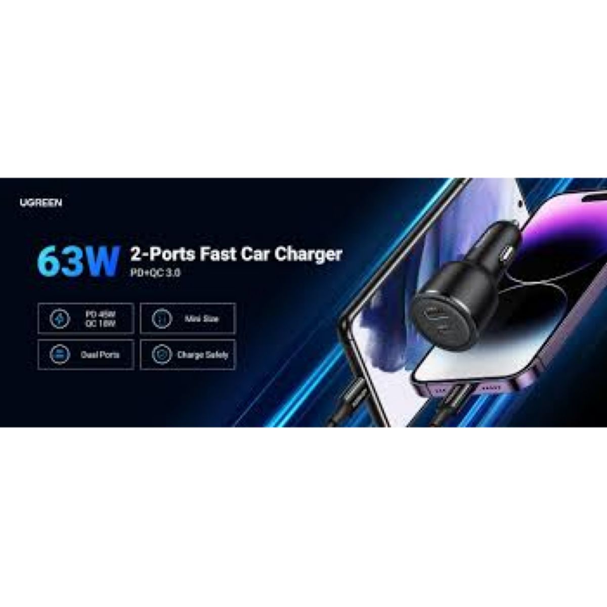 • Cargador Ugreen De Auto Usbc Pd Usb 63w Negro